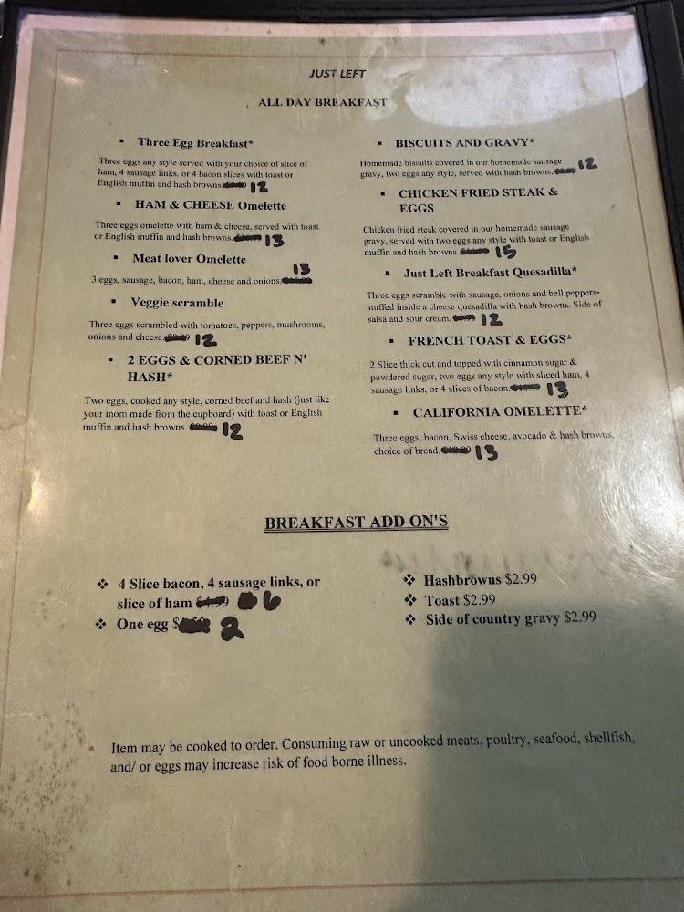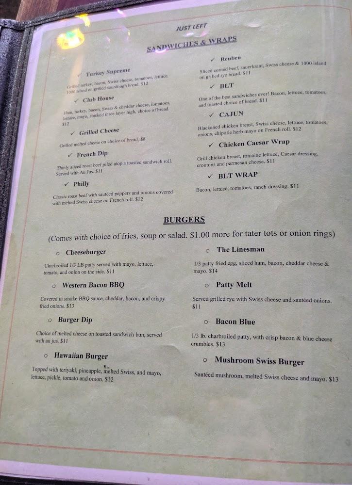 Just Left’s menu features an array of American pub classics. The chicken wings steal the spotlight with different sauces. Burgers are filling and satisfy cravings easily. Breakfast items are served throughout the day, such as the massive breakfast quesadilla. Happy hour brings affordable bites and drinks, enhancing the dining experience.
